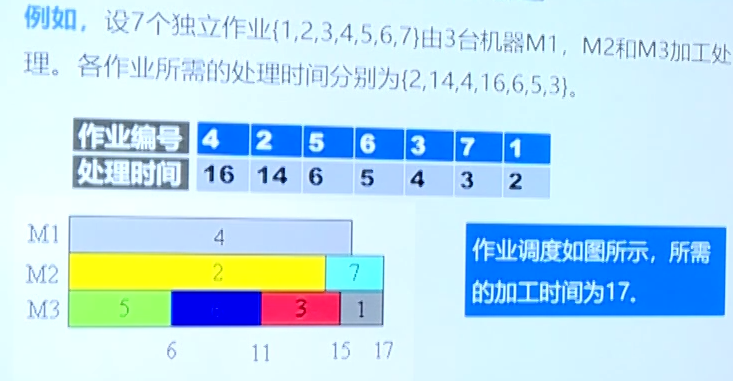 约定,每个作业均可在任何一台机器上加工处理,但未完工前不允许终端处理。作业不能拆分成更小的子作业 这个问题是NP 完全问题,到目前为止没有有效的解法 对于这一类问题,用贪心策略有时可以设计出较好的近似算法
